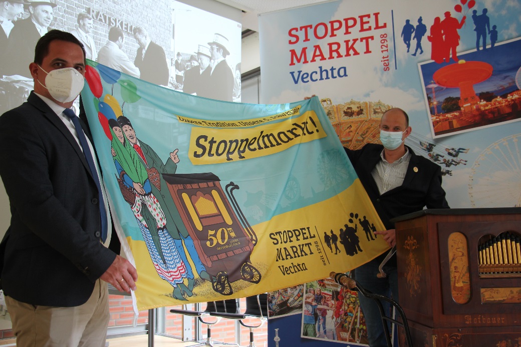 Bis dahin wird die Stadt die Wartezeit für alle Stoppelmarktfreunde ein wenig verkürzen. So hat die Verwaltung anlässlich des Jubiläums einige Aktivitäten geplant. „Die Drehorgeltouren werden nicht nur die Städte und Ortschaften ansteuern, die auch im Jahr 1971 besucht wurden, beginnend mit einer ersten Station in der Stadt Vechta. Die Ausschussmitglieder tragen dabei auch in Anlehnung an die damalige Kleidung der Ausschussmitglieder eine auffällige gelbe Hutkrempe. Diese Hutkrempe trägt ein eigens für das Jubiläum gestaltetes Jubiläums Signet“ verrät Kristian Kater. Da der Stoppelmarkt 2021 und damit auch der Montagsempfang ausfallen, wird den besuchten Persönlichkeiten und Institutionen in diesem Jahr eine Jubiläums Stoppelmarkt-Flagge sowie der traditionelle Krug überreicht. „Die Flagge greift im Design sowohl das traditionelle Motiv von Jan & Libett als auch das Jubiläums-Signet auf. Sie wird nach den Drehorgeltouren für Jedermann im Rathaus käuflich zu erwerben sein. Verkaufsstart ist am 01.07.2021. Der Preis beträgt 20,- Euro“ so Marktmeister Jens Siemer. Am 6. August 2021, am Tag der ersten Drehorgeltour 1971, wird die Stadt Vechta zudem eine umfangreiche Videodokumentation auf der Internetseite www.stoppelmarkt.de und auf den städtischen Kanälen auf Facebook und Instagram ausstrahlen. Das Video enthält u.a. Interviews mit Zeitzeugen, gibt einen Einblick in die Organisation und dokumentiert die Geschichte der Drehorgelwerbetouren.