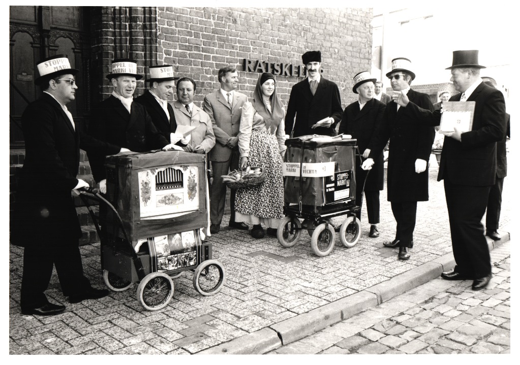Erinnerung an die erste Drehorgeltour 1971: Der Ausschuss für Wirtschaftsförderung und Marktwesen um seinen Vorsitzenden Bernhard Kühling (r.) lud den Wildeshauser Bürgermeister Heinz-Hermann Weinrich (4.v.l.) zum Stoppelmarkt ein. Auf dem Bild zu sehen sind (v.l.) Heinz Filip, Alfons Müller und Josef Grieshop, Heinz-Hermann Weinrich, unbekannt, die Symbolfiguren „Libett (Maria Sult), „Jan“ (Hans-Christian Lorenzen), Aloys Siemer, Leo Vornhusen und Bernhard Kühling.