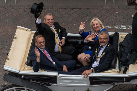 Der Festumzug wurde angeführt von einer Kutsche, in der Vechtas Bürgermeister Helmut Gels und Ehrengast Albert Ritter (Präsident Deutscher Schaustellerbund) sowie die heimischen Bundestagsabgeordneten Franz-Josef Holzenkamp und Gabriele Groneberg (MdB SPD) saßen.