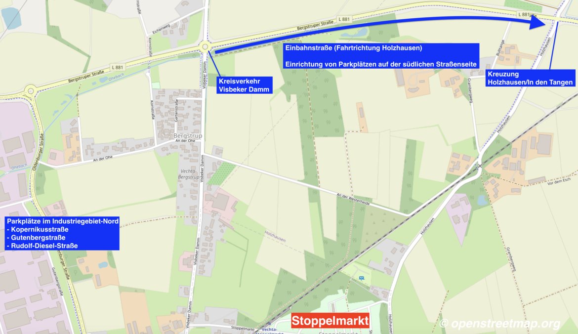 Die Bergstruper Straße bleibt zwischen dem Kreisverkehr Visbeker Damm und der Kreuzung In den Tagen/Holzhausen in Fahrtrichtung Holzhausen Einbahnstraße. In dieser können Besucherinnen und Besucher weiterhin parken. Zudem hilft Personal bei der Einweisung der Autos.