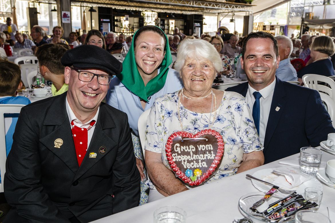 Mit 101 Jahren ist Johanna Beyer wieder einmal die älteste Stoppelmarktbesucherin auf dem 727. Stoppelmarkt. Die Langfördenerin nahm am Freitagnachmittag am Seniorenkaffee in Kühlings Niedersachsenzelt teil. Bürgermeister Kristian Kater und die Traditionsfiguren Jan und Libett beglückwünschten Johanna Beyer und überreichten ihr ein Lebkuchenherz. Über 700 Seniorinnen und Senioren kamen auf Einladung der Stadt Vechta zu der Traditionsveranstaltung.