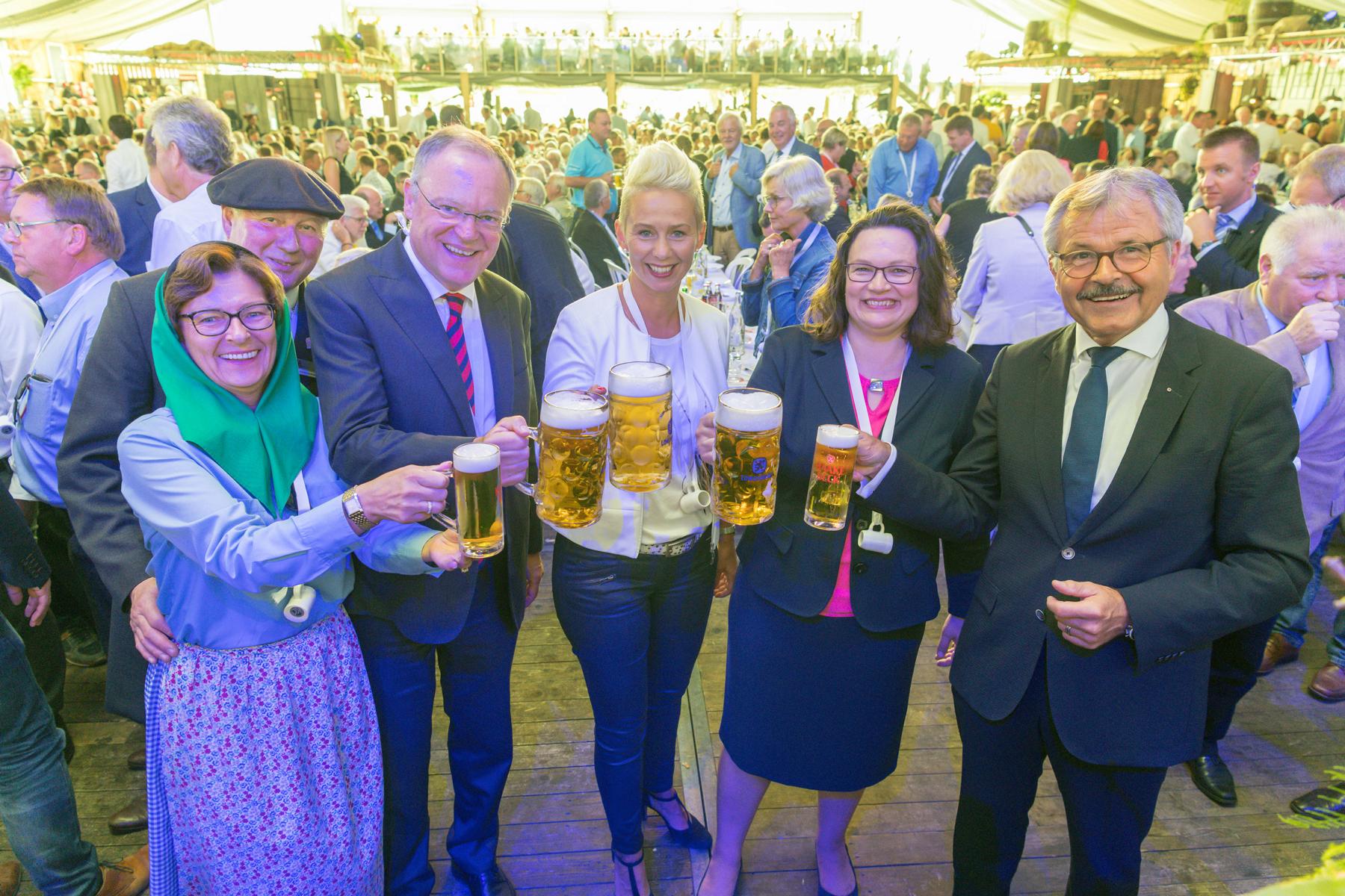 In der SPD gibt Andrea Nahles den Ton an, und auch auf dem Stoppelmarkt in Vechta fand die Parteivorsitzende klare Worte. Die Parteivorsitzende und Vorsitzende der SPD-Bundestagsfraktion hielt beim traditionellen Montagsempfang der Stadt Vechta eine unterhaltsame und kämpferische Rede. 1200 Gäste in Kühlings Niedersachsenzelt, darunter auch der Niedersächsische Ministerpräsident Stephan Weil, fühlten sich gut unterhalten. Vechtas Bürgermeister Helmut Gels dankte Andrea Nahles für ihre Rede und den Besuch auf dem 720. Stoppelmarkt.