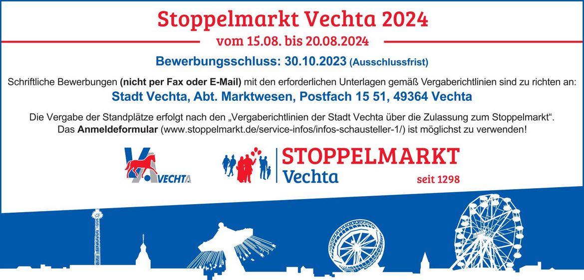 Interessierte Schausteller, Wirte, Einzelhändler, etc. haben die Möglichkeit sich bis zum 30.10.2023 auf einen Standplatz auf dem Stoppelmarkt zu beweben.