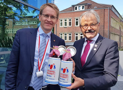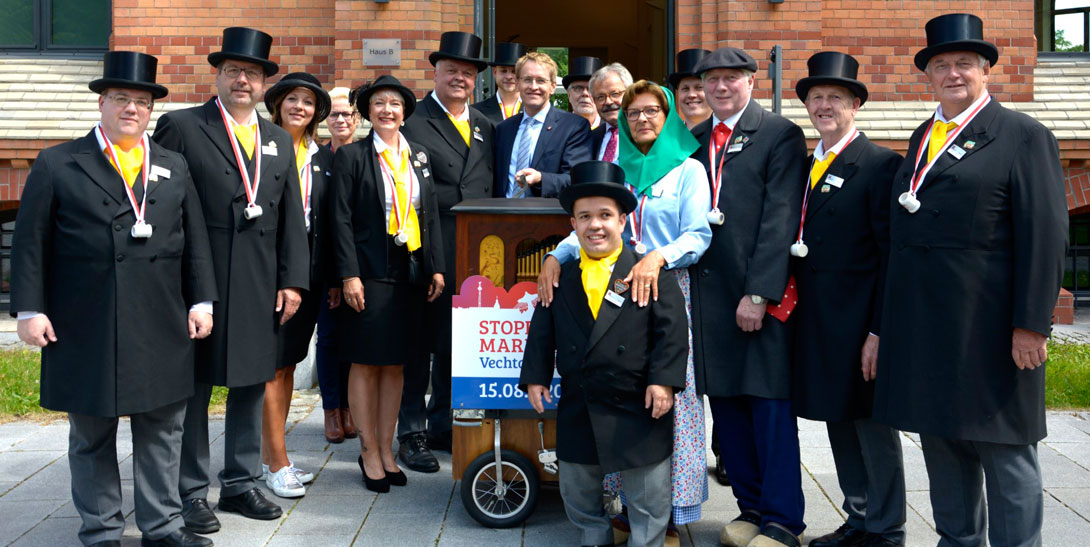 Der diesjährige Festredner beim traditionellen Montagsempfang auf dem Vechtaer Stoppelmarkt steht fest: Daniel Günther. Er ist Bundesratspräsident und Ministerpräsident des Landes Schleswig-Holstein. Am Mittwoch überreichten Vechtas Bürgermeister Helmut Gels, die Traditionsfiguren Jan und Libett sowie die Mitglieder des Ausschusses für Wirtschaftsförderung und Marktwesen die Einladung persönlich in Kiel. Günther, der die Gruppe im Gästehaus der Landesregierung Schleswig-Holstein empfing, nahm die Einladung dankend an. „Ich habe von einer Bekannten schon viel Gutes über den Stoppelmarkt gehört. Ich selbst war schon auf dem Stoppelmarkt in Berlin und freue mich sehr, in diesem Jahr nun in Vechta dabei sein zu dürfen", sagte er. Anschließend ließ er es sich nicht nehmen, sich an der traditionellen Drehorgel zu versuchen.