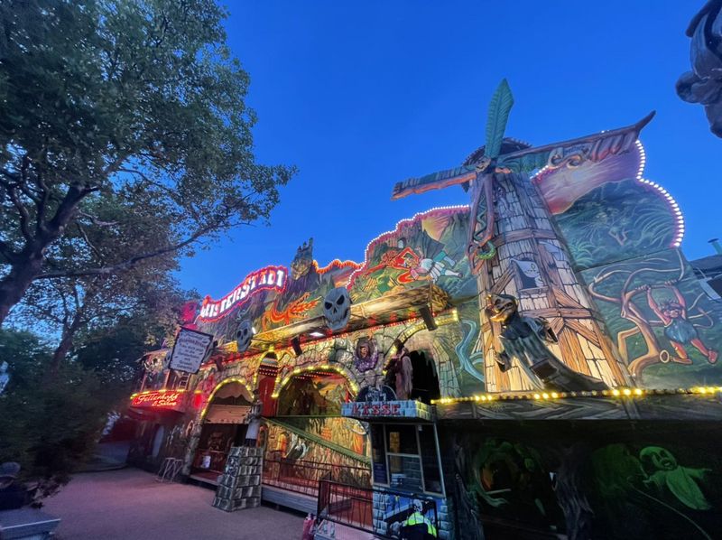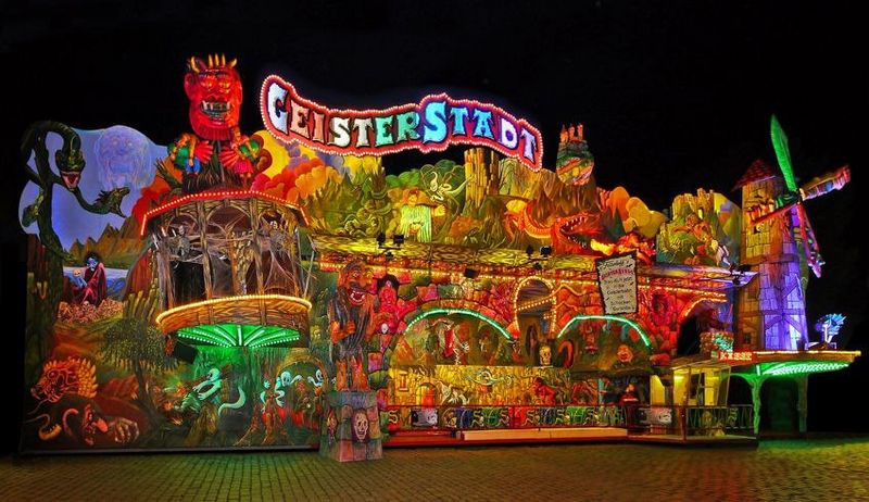 Die Außenfassade ist ebenfalls bemerkenswert. Durch jahrzehntelange Pflege wurde die inzwischen annähernd einmalige, klassische Pinselstrichmalerei der Frontbilder aus den 60er Jahren bis zum heutigen Tage erhalten und durch ein seidenmattes Finish nochmals aufgefrischt. Eine Augenweide, die von zahlreichen LED-Brennstellen und Halogen-Entladungslampen ins rechte Licht gerückt wird. Doch die Augen sind nicht die einzigen Sinnesorgane, die von der Geisterstadt angeregt werden. Es gehört für eine gute Geisterbahn quasi zum guten Ton, auch einen ebensolchen Ton zu bieten: mit einer stimmungsvollen, abwechslungsreichen Beschallung inklusive unterhaltsamer Animation im Außenbereich und einer wahrlich fürchterlichen Geräuschkulisse im Innenbereich. Das Personal ist zudem stil-echt gekleidet und begleitet die Fahrgäste im dunklen Inneren.
